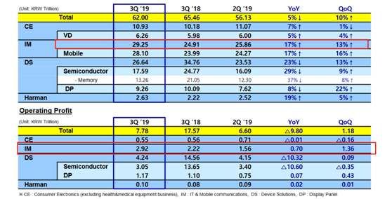 三季度财报还显示,手机事业部营收29.25亿韩元(1700亿元人民币),营业利润高达2.92万亿韩元(176亿元人民币),较第二季度的1.56万亿韩元相比实现翻番。