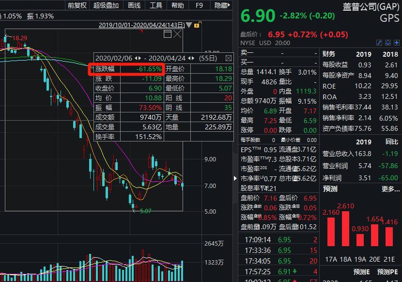 截至4月25日,Gap股价自2月以来已下跌61.65%,报6.9美元/股。市值蒸发大概40亿美元(约合人民币280亿元)。