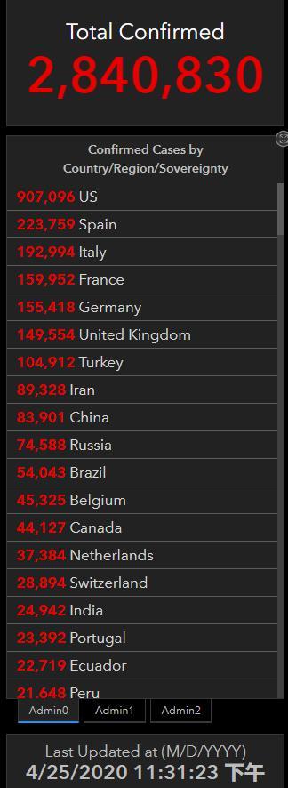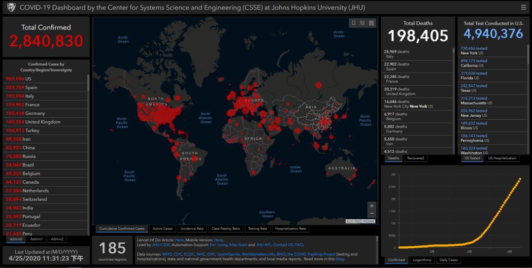 全球疫情继续增长,美国约翰斯·霍普金斯大学25日发布的新冠疫情最新统计数据显示,截至北京时间4月25日23点31分左右,全球确诊新冠肺炎达284万例,死亡19.84万例。