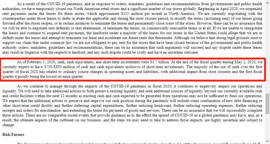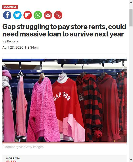由于疫情爆发,为响应政府和公共卫生当局的指令,GAP已暂时关闭了北美零售商店和全球范围内的许多商店。从2020年4月开始,GAP将立即中止北美地区商店租赁的每月租金1.15亿美元。