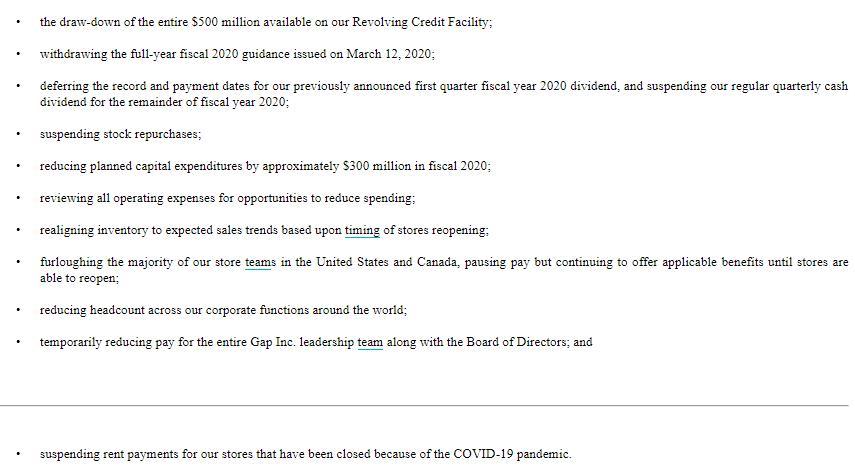 像许多美国公司一样,Gap已经撤回了全年目标,暂停了派息,解雇了雇员,并削减了现有的信贷额度。