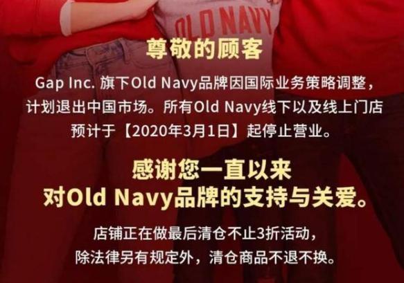 值得的是,今年3月,Gap集团旗下品牌Old Navy(老海军)宣布正式关闭中国市场所有销售渠道,未来会把业务重心放在北美市场,以实现效益最大化。此前,从2014年进入到如今宣布退出,该品牌在中国内地共有10家门店,分布在北京,上海、广州,重庆等。