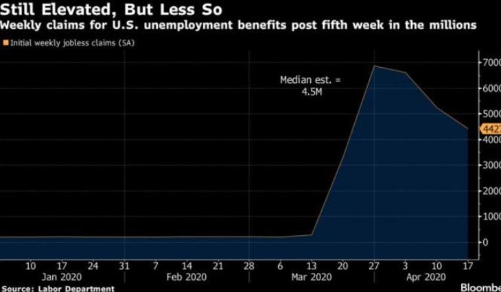 当地时间4月23日周四,美国劳工部公布的最新数据显示,截至4月18日当周美国初请失业金人数录得442.7万,略高于接受道琼斯调查的经济学家预期430万。