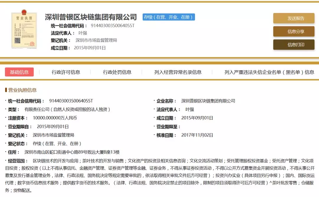 工商登记信息显示,普银集团2015年9月成立,法定代表人叶强,注册资本1亿元人民币。经营范围非常广泛,涵盖区块链技术、茶叶技术、文化产业、股权投资、兴办实业、货运代理、数字货币等领域。