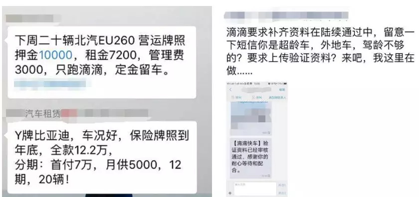 在采访中,中新经纬了解到,不少网约车微信群里会出现大量倒卖或出租车辆的情况。“通常是针对没有本地车,又想开专车或快车的人,卖的车通常有营运资质,如果不是本地人,对方会用他人姓名帮你注册,同时提供相应的银行卡。”滴滴车主宋先生告诉中新经纬,“另一种广告是帮外地车辆从内部注册账号,具体怎么操作不知道。”