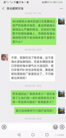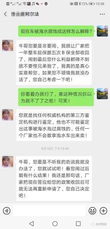 昨天下午,记者拨通了北京豪骏行汽车销售服务有限公司销售人员的电话。关于卖给牛先生海水腐蚀车辆一事,该销售人员表示,“是有这回事儿,但车辆是厂家提供的,4S店只负责销售。后续的问题一直是售后负责。”
