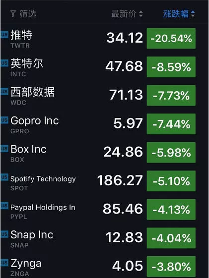 前一天报收于42.94美元的推特,昨日开盘前股价已经跌破37美元,开盘后依旧一路走低,截止收盘其股价已经下跌超过20%,最终报收于34.12美元。股价大跌之下,公司市值损失66.4亿美元。(约合人民币452.2亿元)