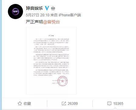 今年5月27日晚,北京坤音娱乐经纪有限公司(简称“坤音娱乐”)发布声明称,坤音娱乐委托音悦台在其经营的线上商城中代理销售该公司艺人的专辑,自2018年10月11日起陆续发送共计60500张专辑,在音悦台已经取得全部对应销售款项的情况下,坤音娱乐至今未收到任何结算费用。