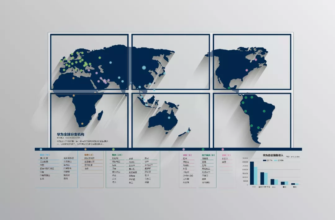 根据华为2017年年报,目前华为业务遍及全球170多个国家和地区,服务全世界1/3以上的人口。2017年,华为销售收入实现6036.21亿元,其中,受益于企业业务数字化转型加速和智能手机市场份额的提升,欧洲、中东、非洲地区实现销售收入人民币1638.54亿元,同比增长4.7%;亚太地区实现销售收入744.27亿元,同比增长10.3%。只有美洲区域受拉丁美洲运营商业务市场投资周期波动影响,销售收入有所下滑,为人民币392.85亿元。