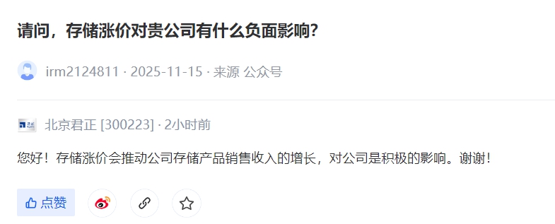 【V观财报|北京君正:存储涨价会推动公司存储产品销售收入增长】北京君正11月20日在互动平台回应称,存储涨价会推动公司存储产品销售收入的增长,对公司是积极的影响。(中新经纬APP)