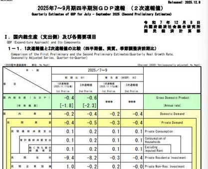 据日本共同社报道,日本三季度GDP修正值下调为年率下降2.3%。美国政府的高关税政策依然是造成该数据下降的要...