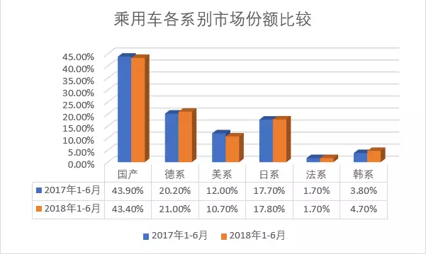 1-6月,德系、日系、美系、韩系和法系乘用车分别销售247.28万辆、209.12万辆、125.86万辆、55.22万辆和19.68万辆,分别占乘用车销售总量的21%、17.76%、10.69%、4.69%和1.67%。与上年同期相比,美系品牌市场占有率有所下降,法系持平,其他品牌呈小幅增长,韩系增速居前。
