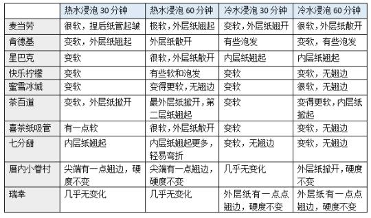 记者从茶饮门店了解到,星巴克热饮出杯温度约为62℃,最高约68℃,一点点的热饮温度在55-70℃。测评中,记者将环保吸管分别放置在冰水和50℃热水中,在30分钟和60分钟后,取出吸管,观察其形变。