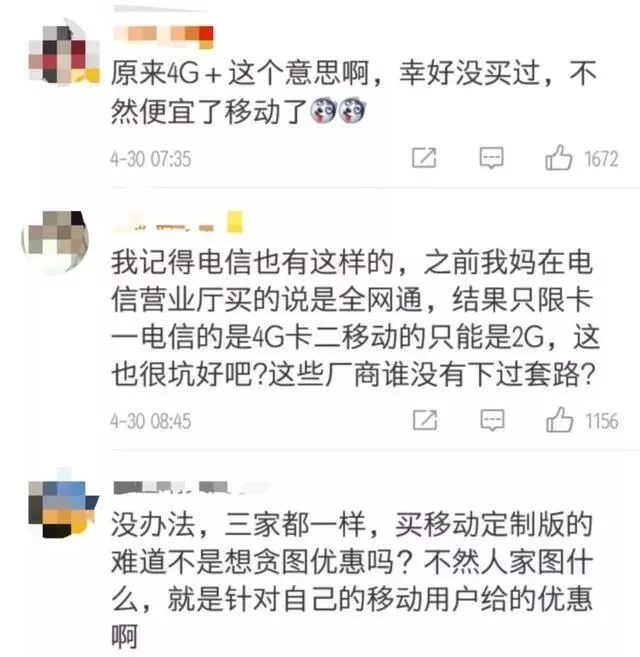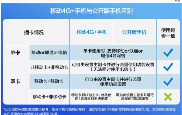 据悉,移动4G+版本的手机是手机厂商与中国移动合作的定制机型,仅限于使用移动的4G信号,其他运营商SIM卡插入副卡卡槽只能使用2G流量。
