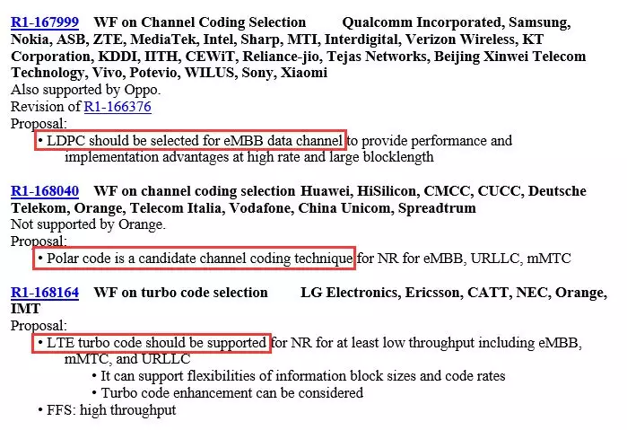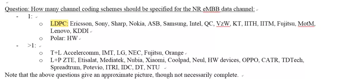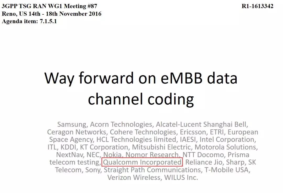 LDPC方案由高通牵头,支持者包括三星、诺基亚、中兴、联发科、英特尔、夏普、vivo、OPPO、小米,以及美日韩的主要电信运营商。