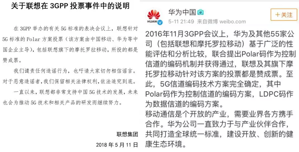 ▲联想发给媒体的声明(左)与华为官方在微博上的表态(右)