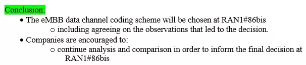 在第一次会议上,各方并没有进行表决。而是决定将eMBB编码方案的投票表决放到下次会议(即RAN1#86bis会议)上。