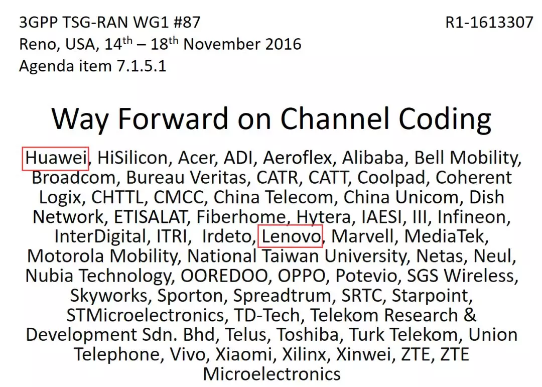 在离开会议现场之前,潘峮的同事用4G手机拍了一张照片,照片上记录着与华为共签方案其他公司的名称,这个方案将华为的Polar Code作为短码信道控制编码方案。一起共签的公司包括中国的移动、联通、电信以及中国台湾的联发科技中联科,美国的Dish Network,日本的东芝。