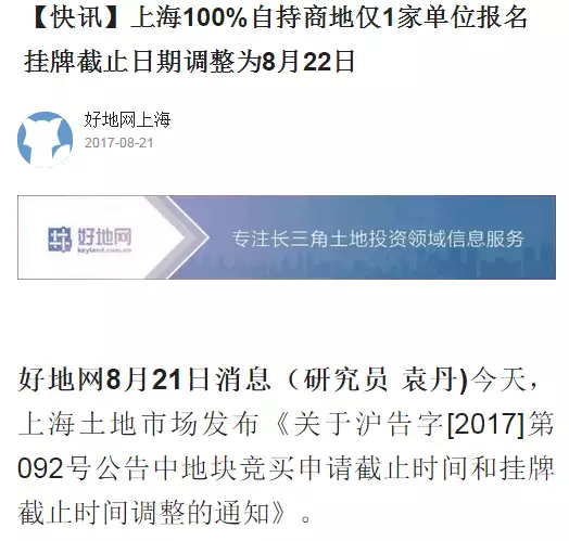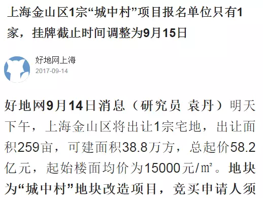 在土拍市场,一个地块只有一名申请人的情况也有发生。如上海在去年8、9月份就有两个案例,但分别为自持商地及城中村项目,如图: