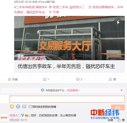 9月25日,唐女士通过微博将事件整理发布并@优信小二。优信小二回复称,已收到反馈,马上协调。不过,唐女士表示,截至目前还是没有人与她联系。