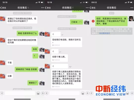 8月份,唐女士终于等到优信方面的人主动与她联系了。不过,这位自称天津优信空港分部售后人员韩佳华(音)称,2018年年初,优信天津公司分成了两个部分,一部分是优信空港分部,另一部分是优信运达分部;车是在运达分部买的,但每次售后都会反馈到空港分部,这跟空港分部没关系,得去找运达分部解决问题。