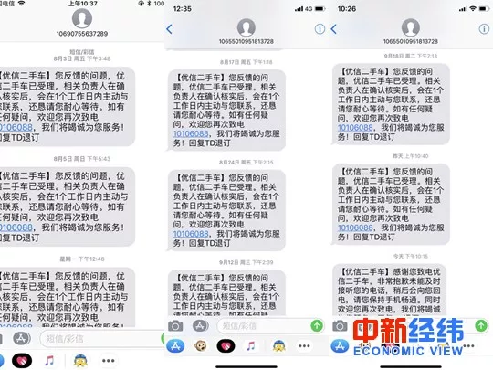 “您反馈的问题,优信二手车已受理。在确认核实后,会在1个工作日内主动与您联系。”唐女士无奈地向中新经纬表示,类似的短信她已经收到上百条了,但优信方面并没有工作人员出面解决问题。与此同时,因唐女士表示要拒绝再为这辆车还贷款,唐女士家人接到的催债骚扰电话也越来越多了。