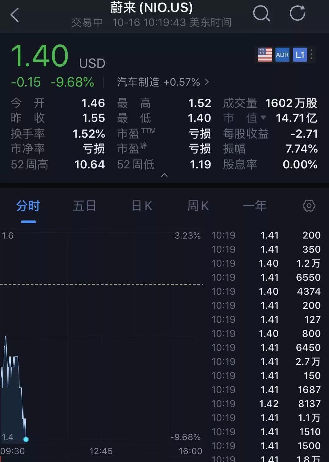 这已经不是蔚来第一次闪崩,在过去不久的国庆前后,从9月23日起,分别跌10.53%、跌20.22%、跌5.53%、跌4.39%、跌10.71%、跌10.86%,而10月1日晚间,美股开盘之后,蔚来汽车还是继续崩了,最高跌超20%。短短几个交易日就直接腰斩,跌到了1.3美元/股,累计跌幅56%。
