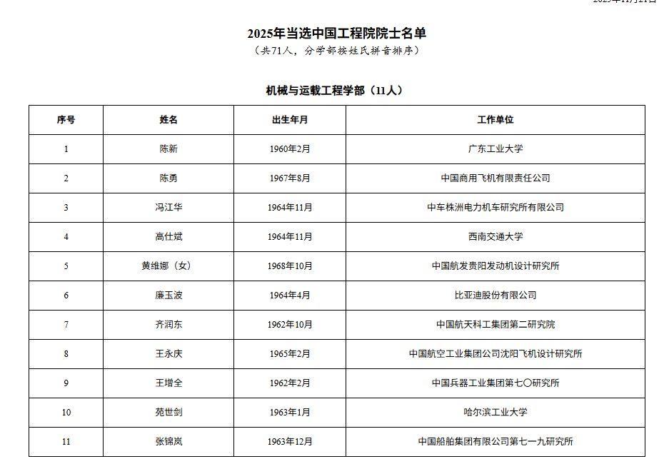 11月21日,中国科学院、中国工程院公布2025年院士增选结果。3位来自民营企业的专家当选中国工程院院士,分别是:比亚迪股份有限公司廉玉波、金发科技股份有限公司黄险波、宁德时代新能源科技股份有限公司吴凯。