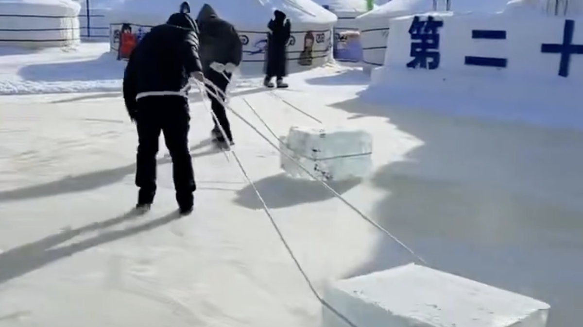 冰面拉冰野地取火 呼伦贝尔冬日冰雪狂欢花样多