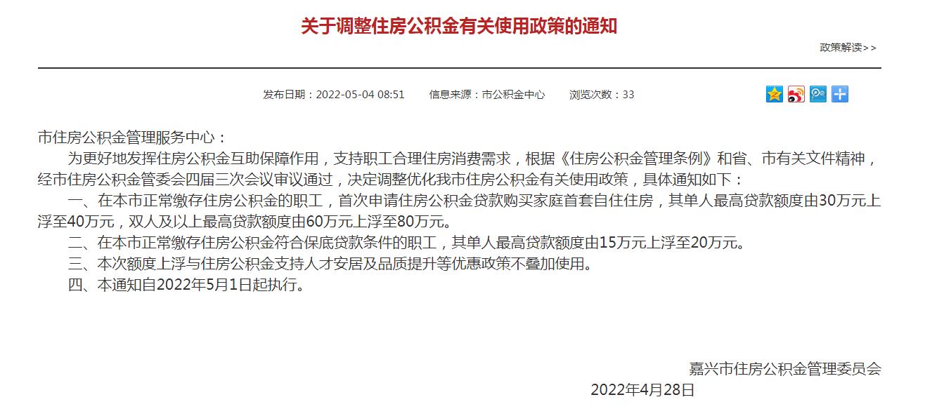 【嘉兴市:调整住房公积金有关使用政策】嘉兴市住房公积金管理服务中心印发通知,在本市正常缴存住房公积金的职工,首次申请住房公积金贷款购买家庭首套自住住房,其单人最高贷款额度由30万元上浮至40万元,双人及以上最高贷款额度由60万元上浮至80万元。在本市正常缴存住房公积金符合保底贷款条件的职工,其单人最高贷款额度由15万元上浮至20万元。(中新经纬APP)