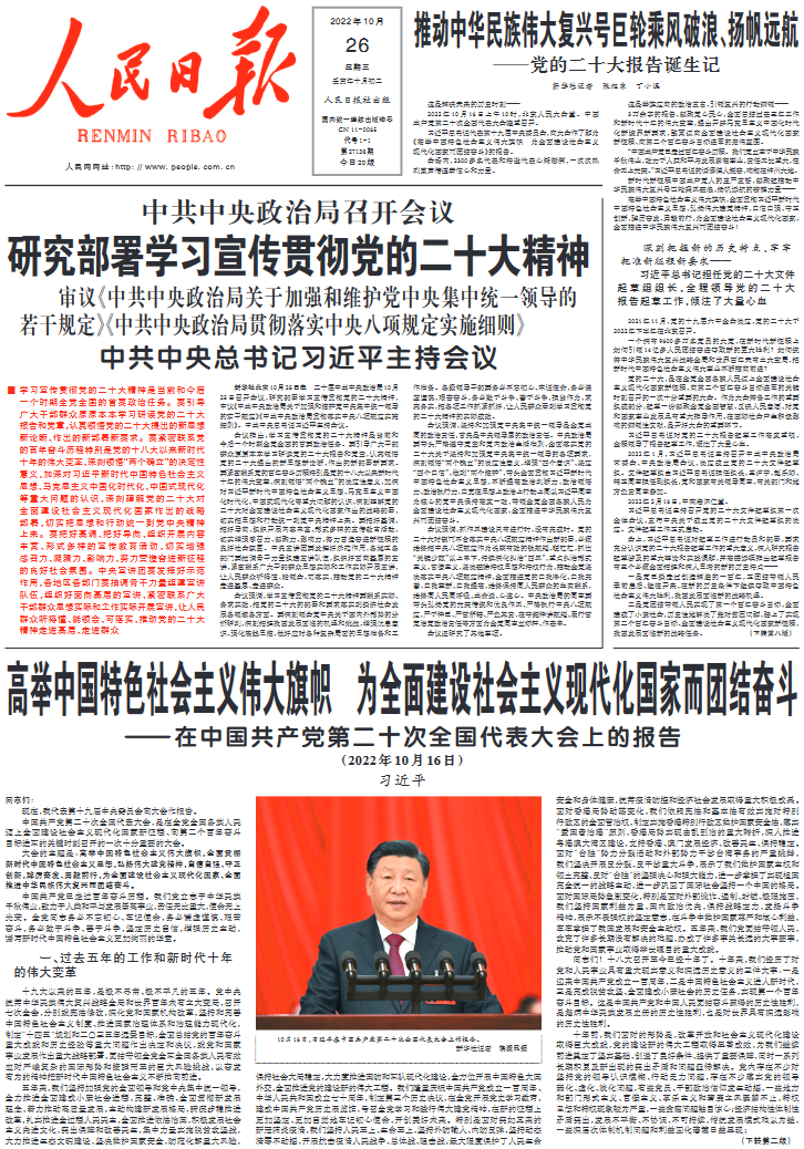 1.中共中央政治局召开会议 研究部署学习宣传贯彻党的二十大精神 审议《中共中央政治局关于加强和维护党中央集中统一领导的若干规定》《中共中央政治局贯彻落实中央八项规定实施细则》 中共中央总书记习近平主持会议;