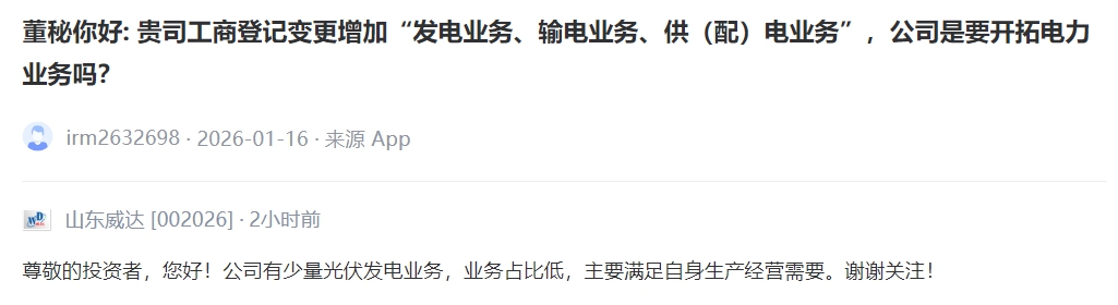 【V观财报丨山东威达:公司有少量光伏发电业务,主要满足自身生产经营需要】山东威达1月20日在投资者互动平台回复提问表示,公司有少量光伏发电业务,业务占比低,主要满足自身生产经营需要。(中新经纬APP)