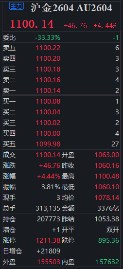 【沪金主力合约突破1100元大关】截至发稿时,沪金主力合约报1100.14元/克,涨幅4.44%,创历史新高。同时,现货黄金也站上4880美元/盎司,日内涨2.46%。(中新经纬APP)