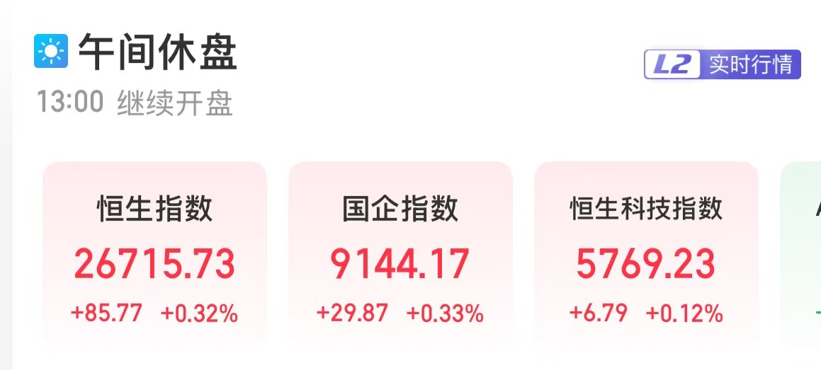 【港股三大股指午盘收涨】截至港股午盘,恒生指数涨0.32%,恒生科技指数涨0.12%。林业与纸制品板块、建筑产品板块涨幅居前。个股方面,顺丰同城涨超9%,老铺黄金涨超7%,呷脯呷脯涨近4%,天齐锂业涨近3%,新东方、阿里巴巴等涨超2%;万达酒店发展跌超5%。(中新经纬APP)