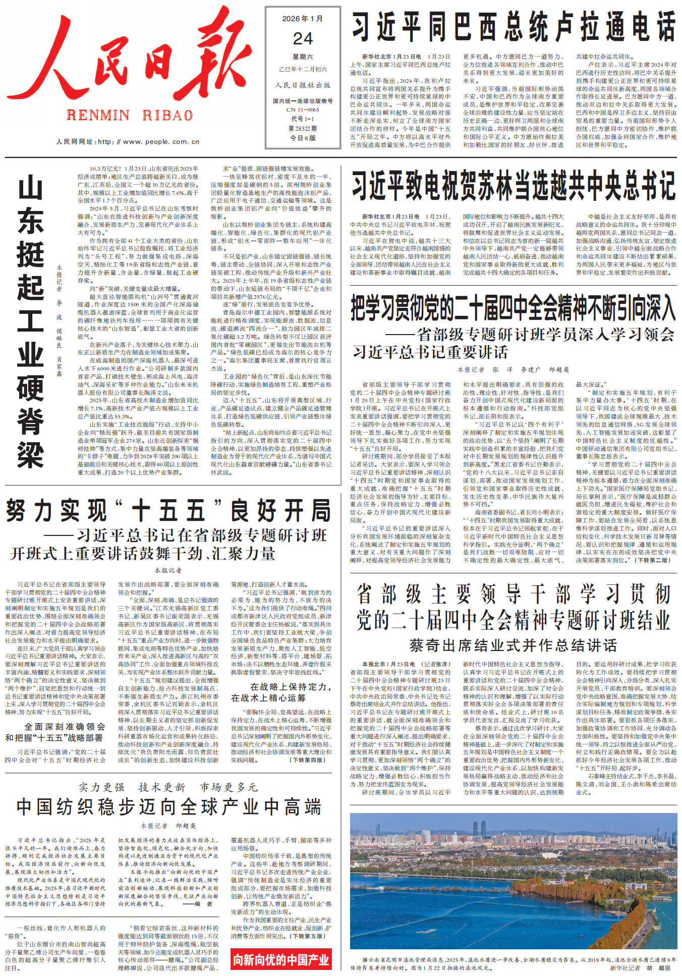 【1月24日《人民日报》头版主要内容】1、山东挺起工业硬脊梁;2、习近平同巴西总统卢拉通电话;3、习近平致电祝贺苏林当选越共中央总书记;4、把学习贯彻党的二十届四中全会精神不断引向深入——省部级专题研讨班学员深入学习领会习近平总书记重要讲话;5、努力实现“十五五”良好开局——习近平总书记在省部级专题研讨班开班式上重要讲话鼓舞干劲、汇聚力量;6、省部级主要领导干部学习贯彻党的二十届四中全会精神专题研讨班结业 蔡奇出席结业式并作总结讲话;7、实力更强 技术更新 市场更多元 中国纺织稳步迈向全球产业中高端(向新向优的中国产业);8、图片报道。(人民日报)