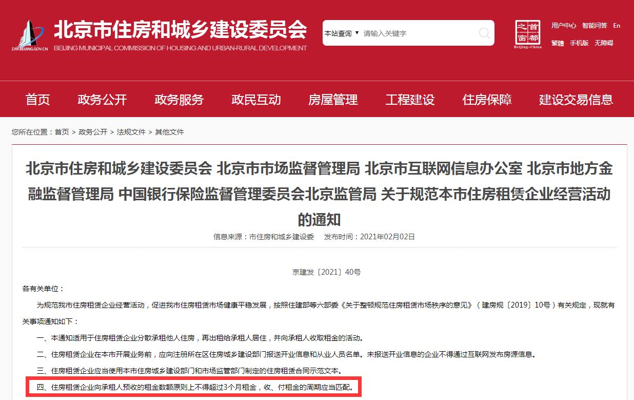 北京:住房租赁企业不得预收超3个月租金