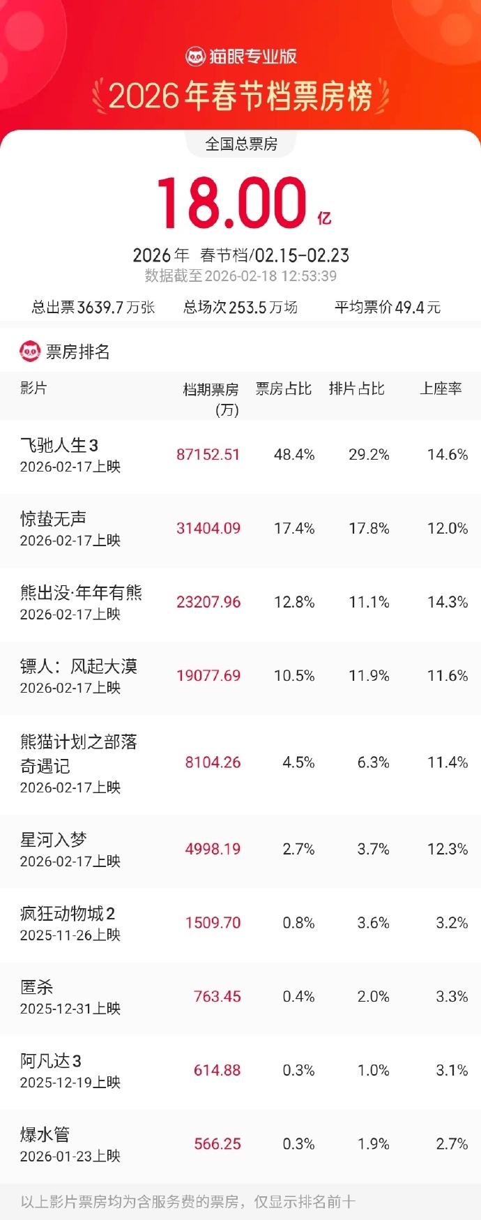 【2026年春节档票房破18亿】据“猫眼专业版”微博消息,2026年春节档档期总票房(含预售)破18亿,《飞驰人生3》《惊蛰无声》《熊出没·年年有熊》分列前三位。(中新经纬APP)