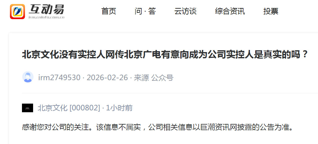 【V观财报|网传北京广电有意向成为公司实控人?北京文化否认】有投资者在深交所互动易平台向北京文化提问:北京文化没有实控人,网传北京广电有意向成为公司实控人是真实的吗?北京文化回复称,该信息不属实。(中新经纬APP)