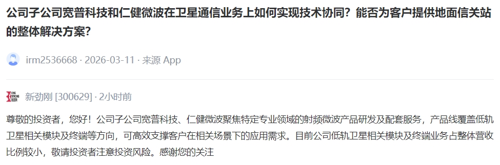 【V观财报丨新劲刚:目前公司低轨卫星相关模块及终端业务占整体营收比例较小】新劲刚3月23日在投资者互动平台回复提问表示,公司子公司宽普科技、仁健微波聚焦特定专业领域的射频微波产品研发及配套服务,产品线覆盖低轨卫星相关模块及终端等方向,可高效支撑客户在相关场景下的应用需求。目前公司低轨卫星相关模块及终端业务占整体营收比例较小,敬请投资者注意投资风险。(中新经纬APP)
