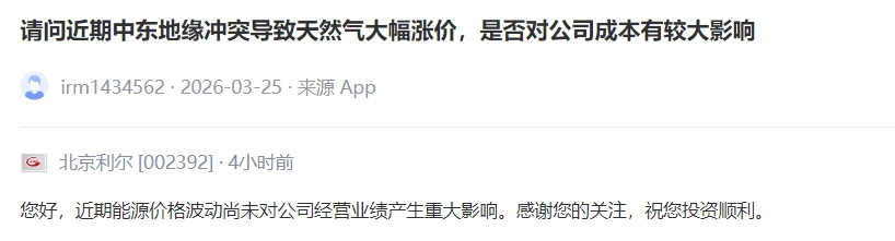 【V观财报丨北京利尔:近期能源价格波动尚未对公司经营业绩产生重大影响】北京利尔3月27日在投资者互动平台回复提问表示,近期能源价格波动尚未对公司经营业绩产生重大影响。(中新经纬APP)