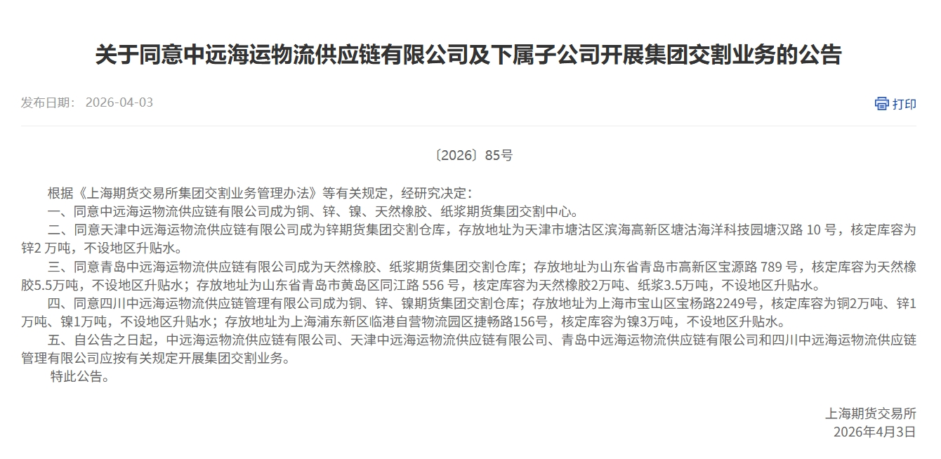 【上期所同意中远海运物流供应链有限公司及下属子公司开展集团交割业务】上海期货交易所公告,同意中远海运物流供应链有限公司成为铜、锌、镍、天然橡胶、纸浆期货集团交割中心。同意天津中远海运物流供应链有限公司成为锌期货集团交割仓库。同意青岛中远海运物流供应链有限公司成为天然橡胶、纸浆期货集团交割仓库。同意四川中远海运物流供应链管理有限公司成为铜、锌、镍期货集团交割仓库。(中新经纬APP)