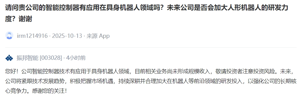 【V观财报|振邦智能:公司智能控制器技术有应用于具身机器人领域】振邦智能10月16日在投资者互动平台表示,公司智能控制器技术有应用于具身机器人领域,目前相关业务尚未形成规模收入,敬请投资者注意投资风险。未来,公司将紧跟技术发展趋势,积极把握市场机遇,持续深耕并合理加大在机器人等前沿领域的研发投入,以强化公司的长期核心竞争力。(中新经纬APP)