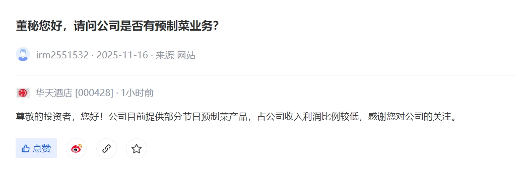 【V观财报|华天酒店:公司目前提供部分节日预制菜产品】针对“公司是否有预制菜业务”相关问题,华天酒店11月18日在投资者互动平台表示,公司目前提供部分节日预制菜产品,占公司收入利润比例较低(中新经纬APP)