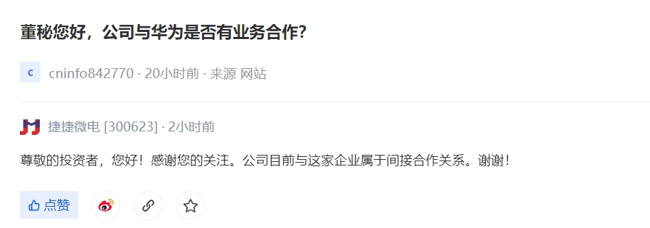 【V观财报|捷捷微电:目前与华为属于间接合作关系】针对“公司与华为是否有业务合作”相关话题,捷捷微电11月18日在投资者互动平台表示,公司目前与这家企业属于间接合作关系。(中新经纬APP)