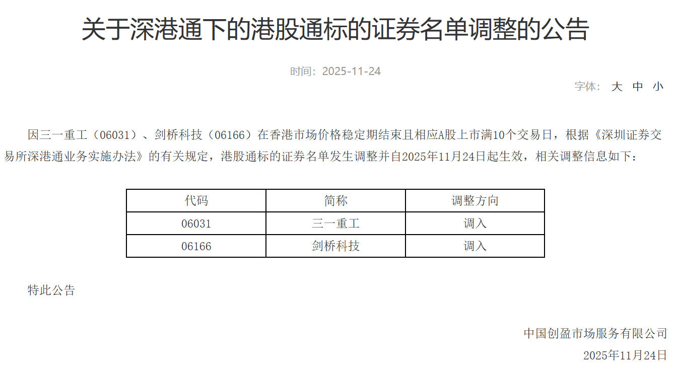 【三一重工、剑桥科技调入深港通下的港股通】深交所发布深港通下的港股通标的证券名单调整的公告,因三一重工(06031)、剑桥科技(06166)在香港市场价格稳定期结束且相应A股上市满10个交易日,根据有关规定,港股通标的证券名单发生调整并自2025年11月24日起生效,调整方向为调入。(中新经纬APP)