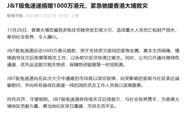 【J&T极兔速递捐赠1000万港元,驰援香港大埔救灾】27日,J&T极兔速递启动1000万港元捐款,用于支持受灾居民的紧急安置、基本生活保障、情绪疏导及灾后恢复等相关工作,以协助灾区尽快渡过难关。同时,公司已开通对港绿色通道,优先运送救灾相关物资,保障物资能够第一时间抵港。(中新经纬APP)