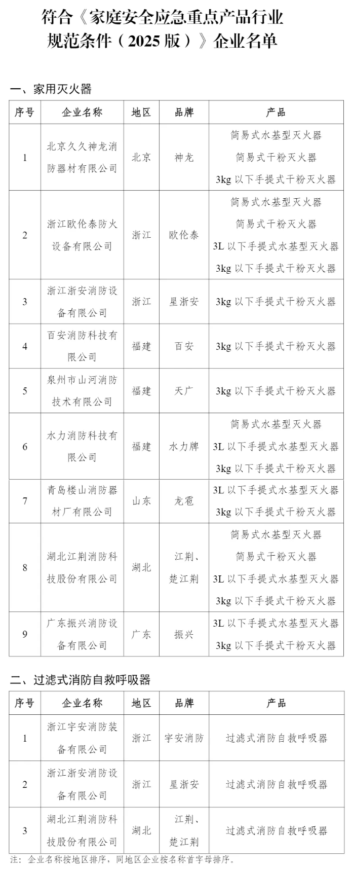 【工信部公布家庭安全应急产品公告企业名单】“工信微报”微信号消息,根据《家庭安全应急重点产品行业规范条件(2025版)》和《家庭安全应急重点产品行业规范公告管理办法》有关要求,经企业自主申报、省级工业和信息化主管部门核实推荐、专家评审、产品抽检、征求相关单位意见、网上公示等程序,现将符合《家庭安全应急重点产品行业规范条件(2025版)》企业名单予以公告。其中家用灭火器9家、呼吸器3家。(中新经纬APP)