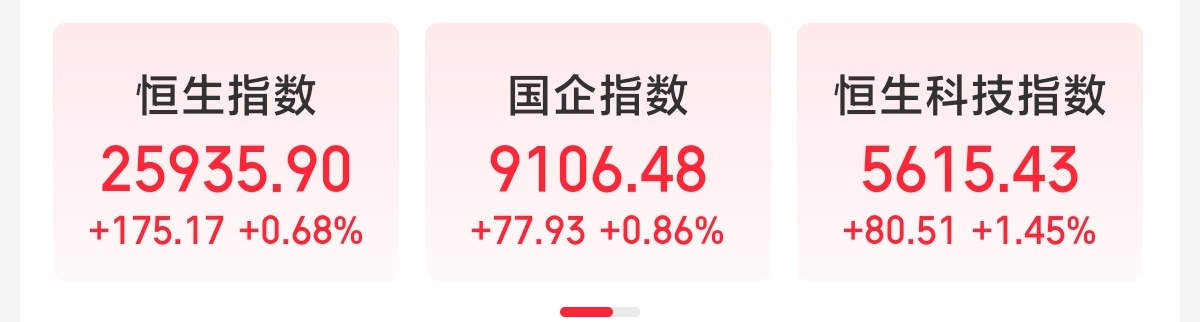 【恒生指数收涨0.68%】恒生指数收涨0.68%,恒生科技指数收涨1.45%,恒生国企指数收涨0.86%。大市成交额1793亿港元。地平线机器人涨近7%,药明康德涨逾5%,小米集团涨逾4%。(中新经纬APP)