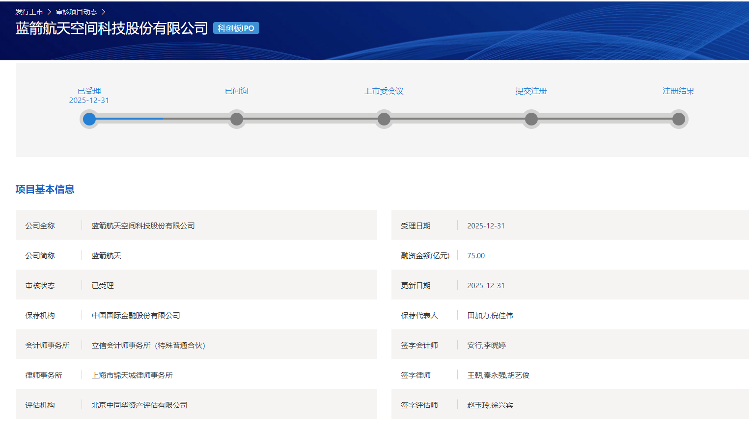 蓝箭航天科创板IPO获受理 拟融资75亿元